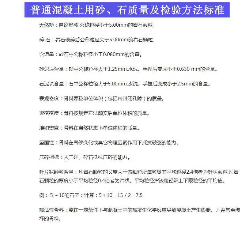 砂石骨料破碎后可以用于加工混凝土,應該按照《普通混凝土用砂、石質量及檢驗方法標準》JGJ52規(guī)定的檢測標準。主要包括堿活性、吸水率、含水率、密度、含泥量、石粉含量、片狀針狀石料含量等要求。具體標準可參考下圖: