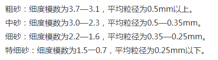 2.細骨料就是小于4.75mm的物料,在混凝土中起著骨架支撐和填充的作用。細骨砂在用于制作混凝土時也應遵循《水工混凝土施工規(guī)范2001》對細骨料的要求 1.細骨料在開采時應該進行堿活性檢測,2.保證細骨料的含水量穩(wěn)定,不可以超過百分之六。同樣按照不同的粒度大小也可以分為粗砂,中砂,細砂特細砂等規(guī)格。如下圖所示: