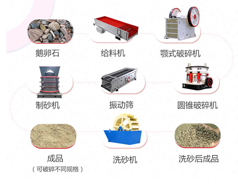 如果是一條完整的砂石骨料生產(chǎn)流程包括振動(dòng)給料機(jī)喂料-顎式破碎機(jī)粗破-圓錐破碎機(jī)二級(jí)破碎-振動(dòng)篩篩出不符合大小的再次送進(jìn)圓錐破碎機(jī)破碎-制砂機(jī)制砂-振動(dòng)篩篩分-洗砂機(jī)-成品。
